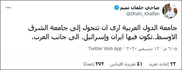 وقال خلفان في تغريدة على “تويتر”: “أرى أن تتحول جامعة الدول العربية إلى جامعة الشرق الأوسط.. تكون فيها إيران وإسرائيل إلى جانب العرب”.