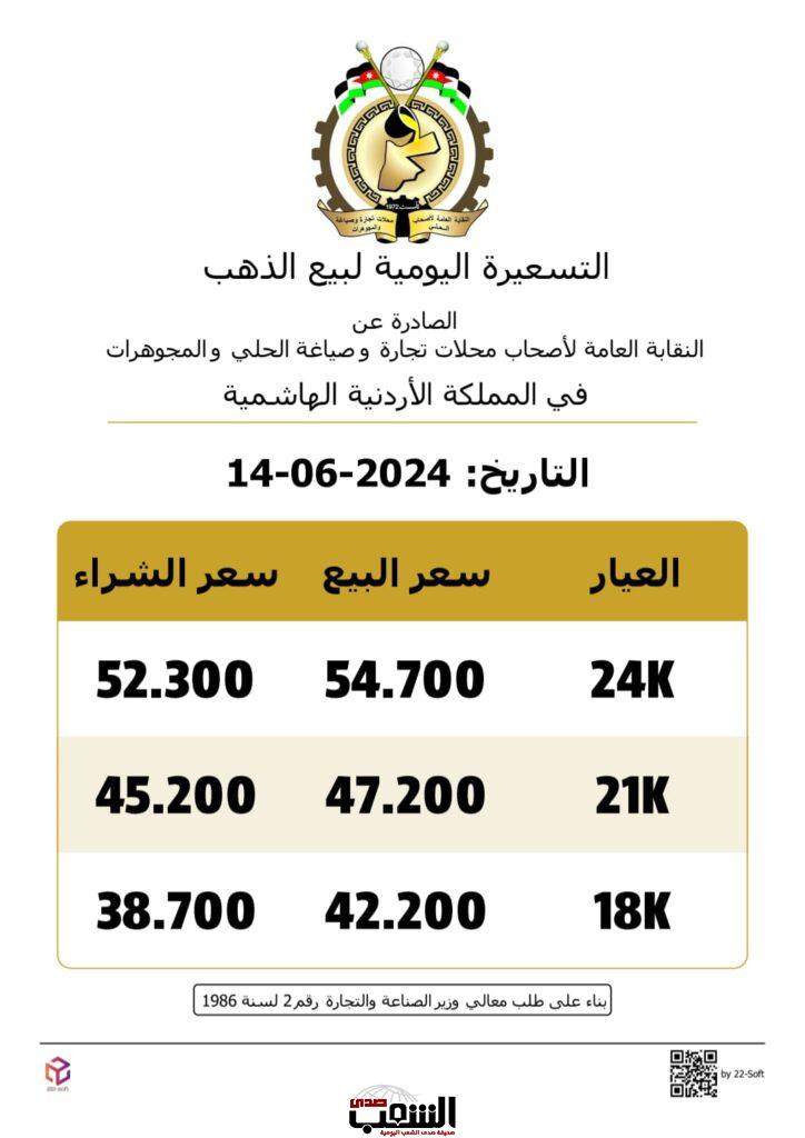 وبلغ سعر جرام الذهب عيار 21، الأكثر رغبة من المواطنين 47.20 دينارا لغايات البيع من محال الصاغة، مقابل 45.200 دينارا لجهة الشراء من الزبون.