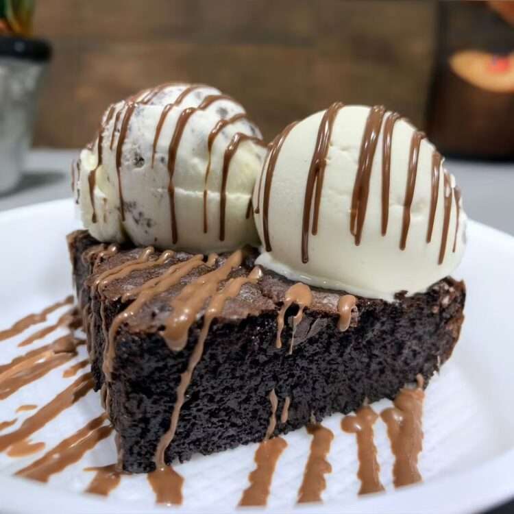 براوني دافئ غني بالشوكولاتة، يُقدَّم مع آيس كريم بارد وكريمي. توليفة لا تقاوم.