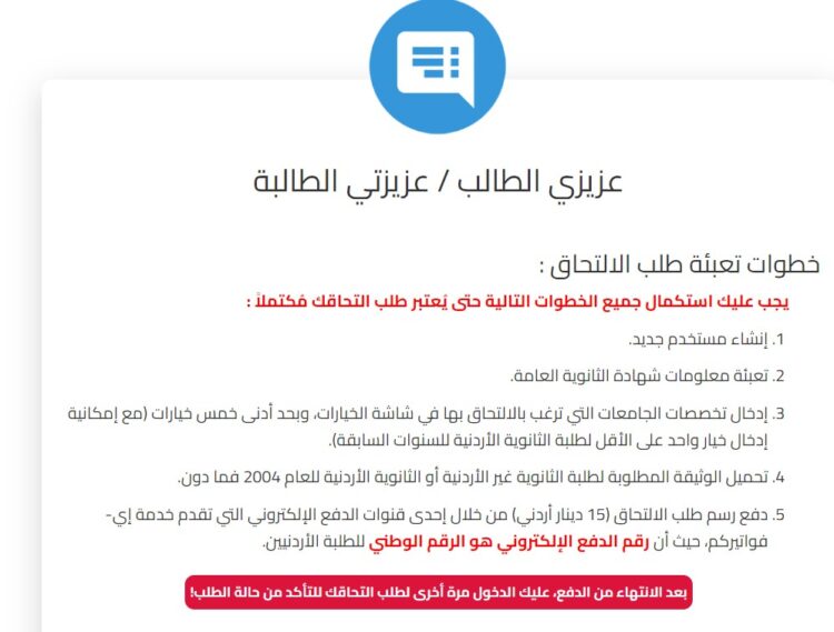صدى الشعب – بدأت عن الساعة 11 و 12 دقيقة الأربعاء، عملية تقديم طلبات الالتحاق الإلكترونية في الجامعات الأردنية الرسمية لمرحلة البكالوريوس، والتي تستمر حتى الساعة الثانيـة عشرة ليلا من يوم الأربعاء الموافق 21 آب الحالي، من خلال الموقع الإلكتروني للوحدة/ قسم مرحلة البكالوريوس.