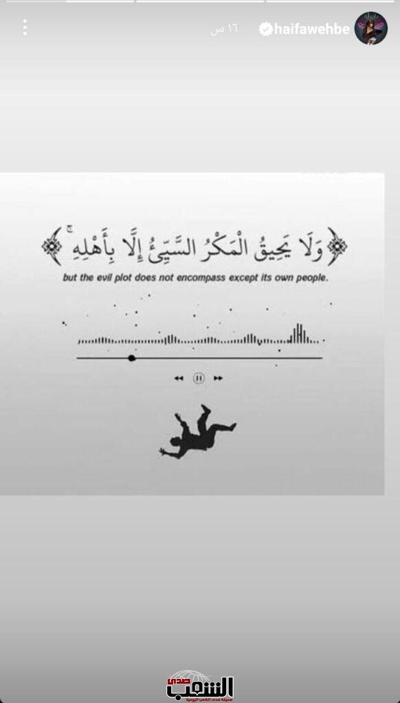ونشرت هيفاء وهبي من خلال حسابها الرسمي بموقع إنستجرام، عبر خاصية الإستوري، نص الآية القرآنية الكريمة: “ولا يحيق المكر السيئ إلا بأهله”.