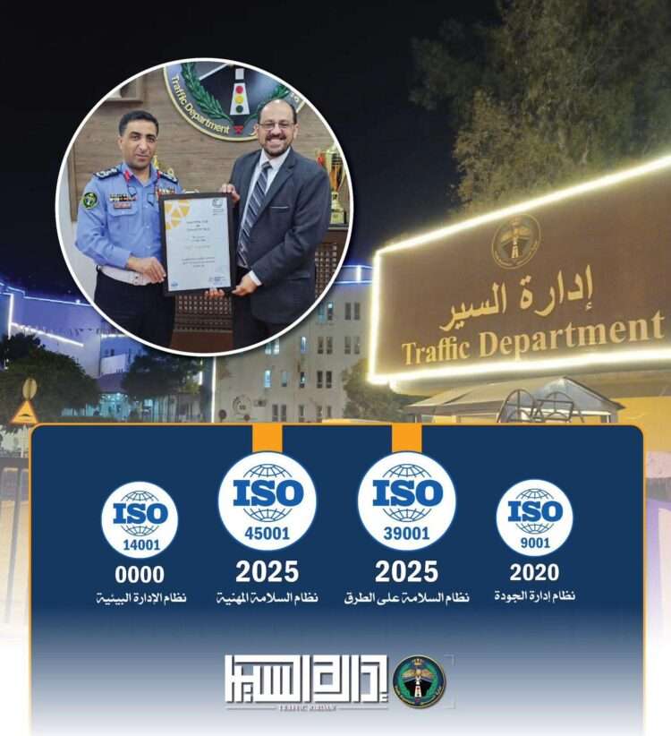 اكد مدير ادارة السير العميد فراس الرشيد على التزام ادارة السير بالاستمرار بتطوير بيئة العمل ضمن معايير الجودة العالمية، وترجمة هذا الانجاز الى خدمات فعلية يلمس أثرها الايجابي كافة المراجعين، فيما اشار المدير التنفيذي لشركة يوكاليبتوس الدكتور نور شحادة ان ادارة السير تعتبر أول جهة أمنية في المنطقة تُطبق هذه المعايير بشكل متكامل ضمن نظم الادارة المتكاملة (IMS) ، فيما ستضم الادارة حالياً لاعمال نظام الادارة البيئية (ISO 14001) .