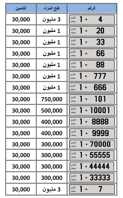 وتكون قيمة التأمين المطلوب (30000) دينار للرقم الواحد ويمكن المزايدة على أي رقم من الأرقام الموجودة بالمزاد، وفي حال الفوز بأحد الأرقام يتطلب ذلك دفع تأمين جديد للمزايدة على باقي الأرقام.