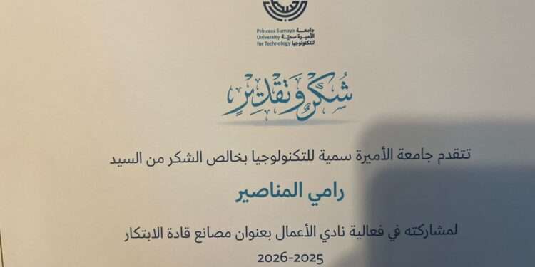 صدى الشعب – كرّمت جامعة الأميرة سمية للتكنولوجيا رائد الأعمال العالمي رامي المناصير تقديرًا لإنجازاته العالميه في الابتكار وريادة الأعمال، حيث ألقى محاضرة مميزة حول ريادة الأعمال والابتكار في عصر التحول الرقمي، مؤكدًا أهمية تمكين الشباب ودعم المشاريع الناشئة