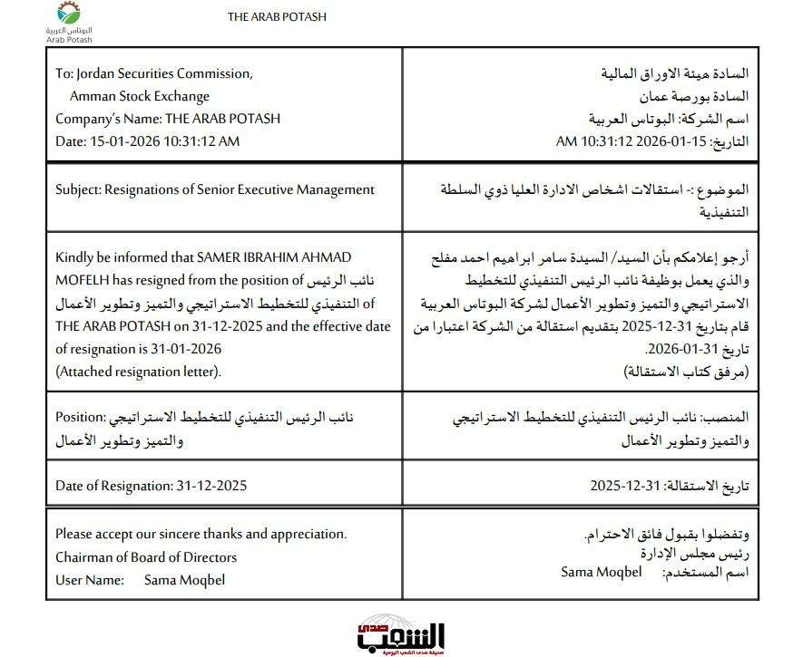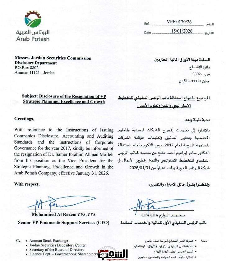 صدى الشعب - أظهر إفصاح نٌشر في (بورصة عمان)، استقالة نائب الرئيس التنفيذي للتخطيط الاستراتيجي و التميز و تطوير الأعمال، الدكتور سامر إبراهيم أحمد مفلح، اعتباراً من تاريخ 31-1-2026.