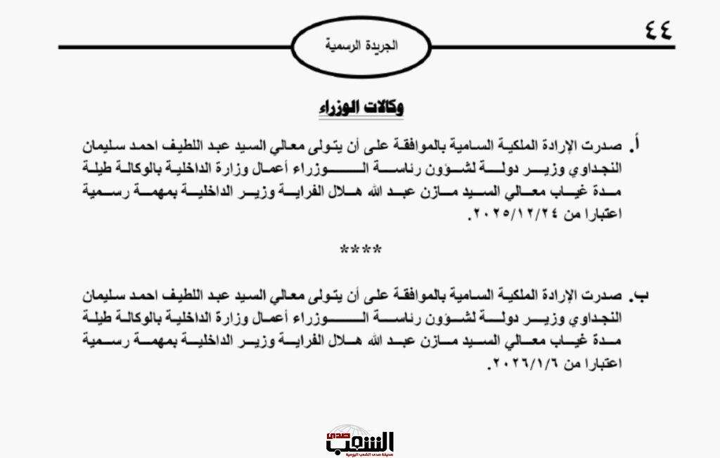 صدى الشعب – كشفت الجريدة الرسمية في عددها رقم 6027، الصادر اليوم الخميس 15-1-2026، عن توكيل وزير الدولة لشؤون رئاسة الوزراء، عبد اللظيف النجداوي بالقياد بأعمال وزير الداخلية خلال فترتين، أولها بدأت و انتهت اعتباراً من 24-12-2025، و الثانية من تاريخ 1-6-2026، بحسب ما يلي السطور و عطفاً على بند (وكالات الوزراء) الصادر في أعداد الجريدة الرسمية..