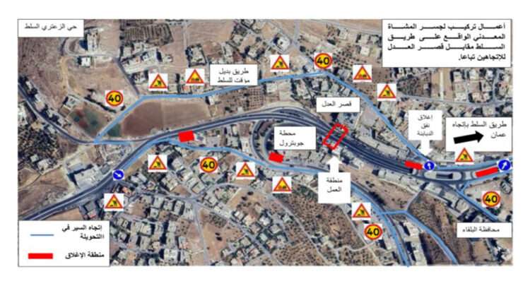 صدى الشعب – أعلنت وزارة الأشغال العامة والإسكان وبالتعاون مع إدارة السير عن بدء تنفيذ أعمال تركيب جسر مشاة معدني على طريق عمان-السلط مقابل قصر العدل في محافظة البلقاء، حيث ستشمل هذه الأعمال إغلاقاً مؤقتاً لحركة السير بشكل كامل في كلا الاتجاهين تباعاً، بالإضافة إلى إغلاق نفق الدبابنة وتحويل حركة المرور إلى أعلاه، وذلك اعتباراً من الساعة الثالثة من فجر يوم الجمعة الموافق 16/1/2026 وحتى ساعات الصباح وحسب مقتضيات العمل والظروف الجوية.