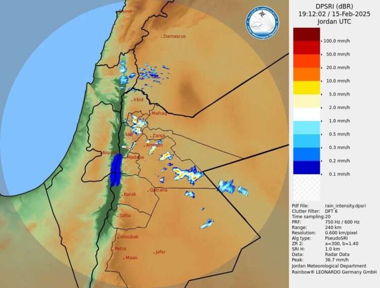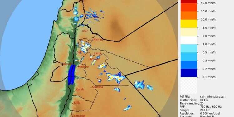 صدى الشعب – تشير آخر الصور الملتقطة لرادار الطقس في ادارة الأرصاد الجوية الأردنية إلى وجود خلايا رعدية ماطرة حاليًا في محافظات العاصمة عمان و البلقاء،وجرش وعجلون ، وشمال محافظة معان، حيث تتساقط زخات غزيرة من الأمطار المصحوبة بالرعد في بعض المناطق.