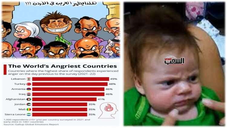 و الحديث هنا بحسب ما رصدته وكالات الأنباء العربية، بالتالي: “حلّ الأردن في المرتبة السادسة عالميًا ضمن قائمة “أكثر الشعوب غضبًا” بحسب تقرير “غالوب للمشاعر العالمية” حيث أظهرت النتائج أن 35% من الأردنيين الذين شملهم الاستطلاع قالوا إنهم شعروا بالغضب في اليوم الذي سبق الاستبيان خلال عامي 2021 و2022.