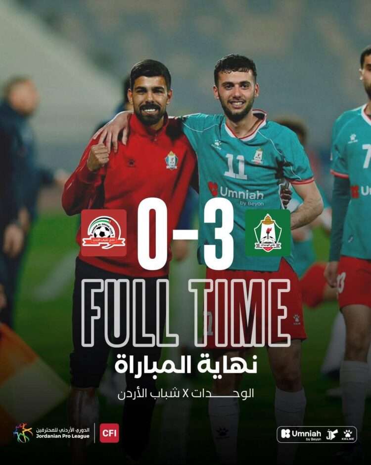 صدى الشعب – فاز فريق الوحدات على نظيره شباب الأردن بثلاثة أهداف دون مقابل، في اللقاء الذي جمعهما مساء الثلاثاء على ستاد الملك عبدالله، ضمن منافسات الجولة 24 من دوري المحترفين لكرة القدم.