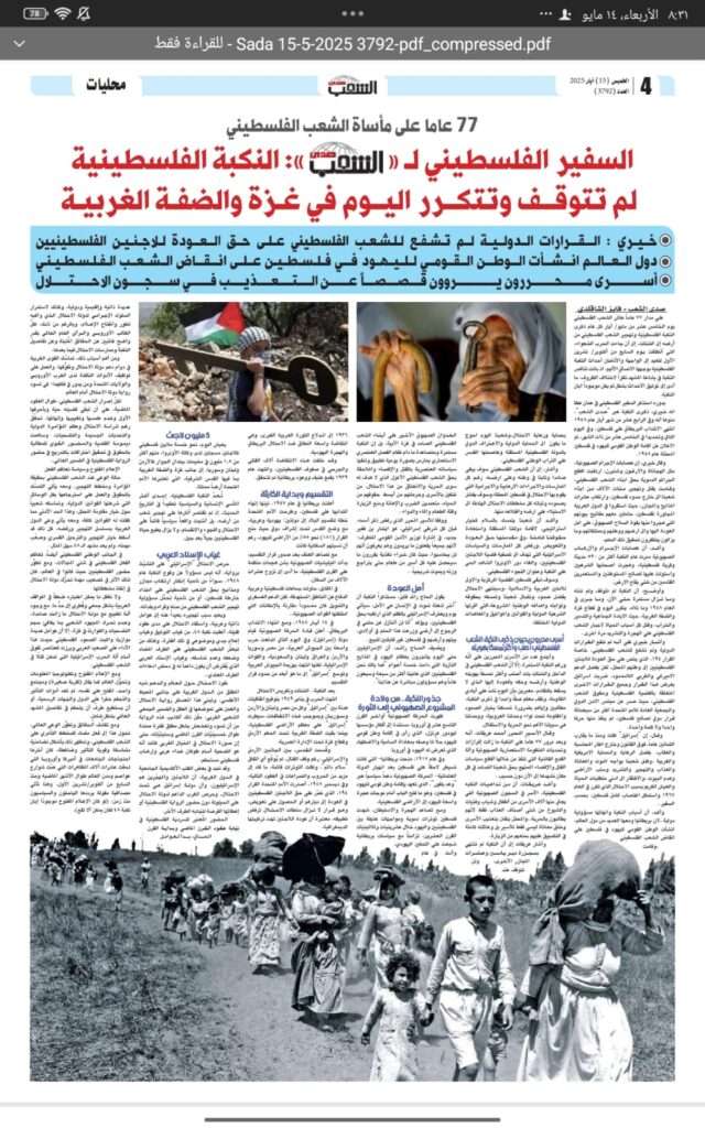 بدوره استذكر السفير الفلسطيني في عمان عطا الله خيري، ذكرى النكبة عبر “صدى الشعب”، منوها أنه وفي الرابع عشر من شهر أيار عام 1948 انتهى الانتداب البريطاني على فلسطين، وفي اليوم التالي وتحديدا في الخامس عشر من ذات الشهر، تم الاعلان عن اقامة الوطن القومي لليهود في فلسطين المحتلة عام 1948.