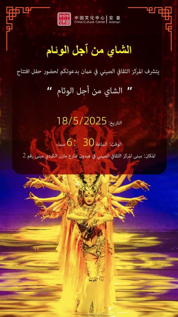 صدى الشعب – أعلن المركز الثقافي الصيني، في بيانٍ مقتضب عن موعد انطلاق فعاليات “الشاي من أجل الوئام” و الذي من المزمع انطلاقه، يوم الأحد (18-5-2025) عند الساعة 6:30 بتوقيت الأردن في المركز الثقافي الصيني في عبدون و الواقع على شارع مازن الكردي مبنى رقم 2، حضوركم يُشرفنا..