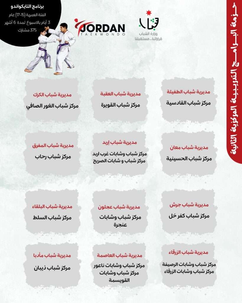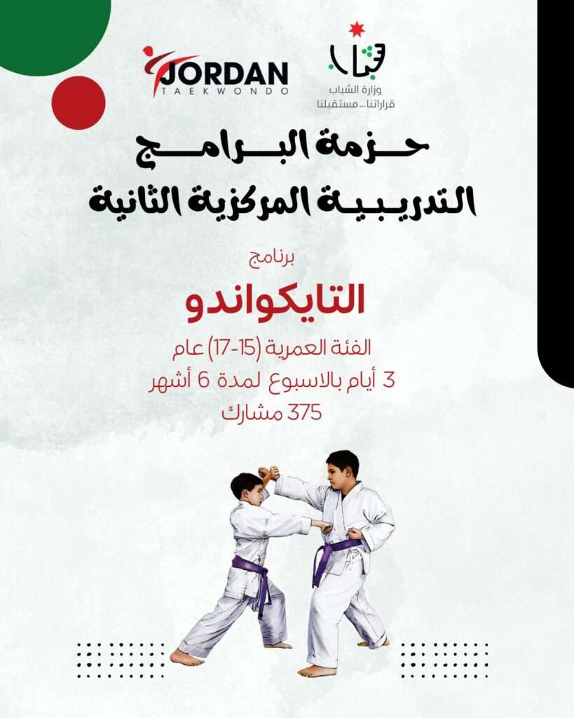 كما تتضمن الحزمة تنفيذ دورة تدريبية في رياضة التايكواندوا بالشراكة مع الاتحاد الأردني للتايكواندوا، والتي تأتي في إطار سعي الوزارة لتعزيز النشاط الرياضي والبدني لدى الشباب وتنمية مهاراتهم في فنون الدفاع عن النفس، وهو بمجمله ما يتناسب مع محور الشباب والصحة والنشاط البدني في الاستراتيجية الوطنية للشباب.