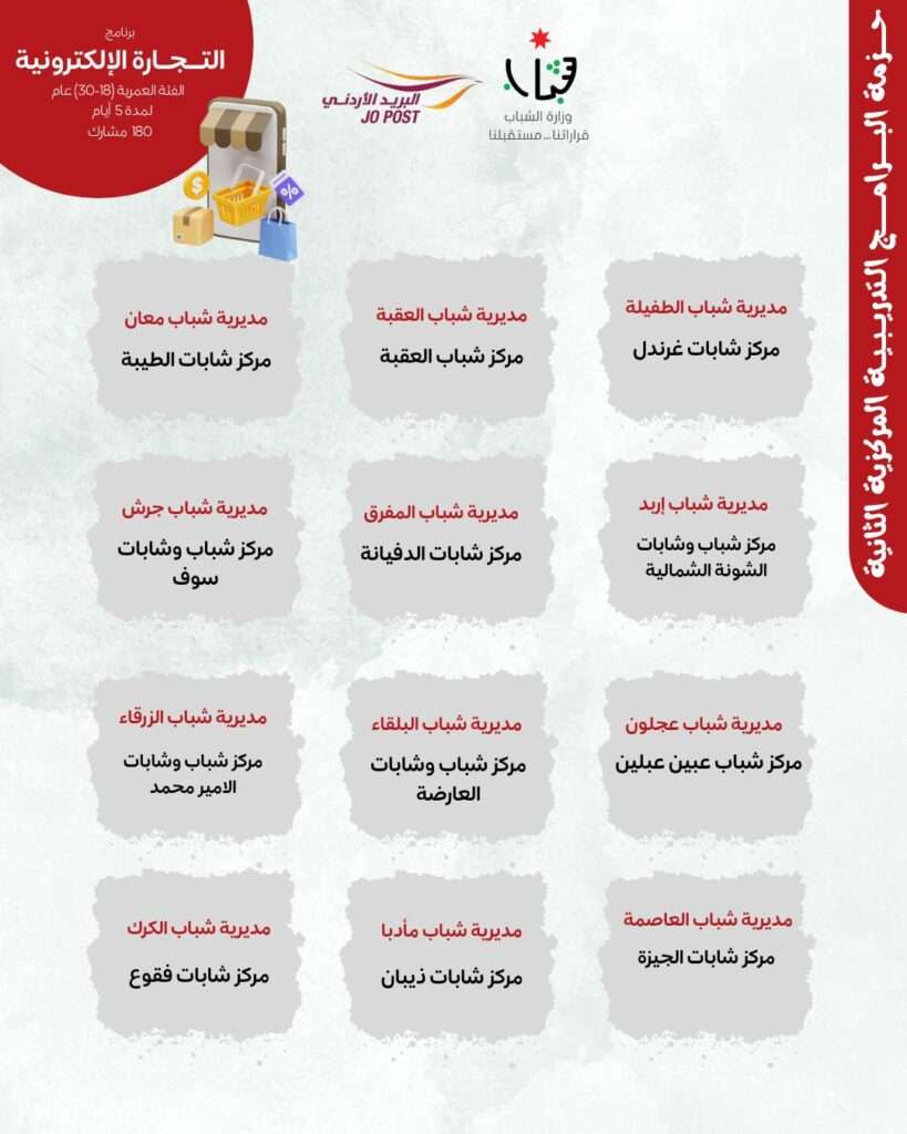 وتتضمن المرحلة الثانية من الحزمة تنفيذ برنامج التجارة الإلكترونية بالشراكة مع شركة البريد الأردني، والذي شهد خلال المرحلة الأولى من الحزم إقبالاً كبيراً من المشاركين الراغبين بتعزيز وبناء مهاراتهم الرقمية التي تتيح لهم دخول سوق العمل من خلال إنشاء وإدارة المتاجر الرقمية ومعرفة أسس ومبادئ التسويق الإلكتروني ورفع القدراة الإنتاجية.