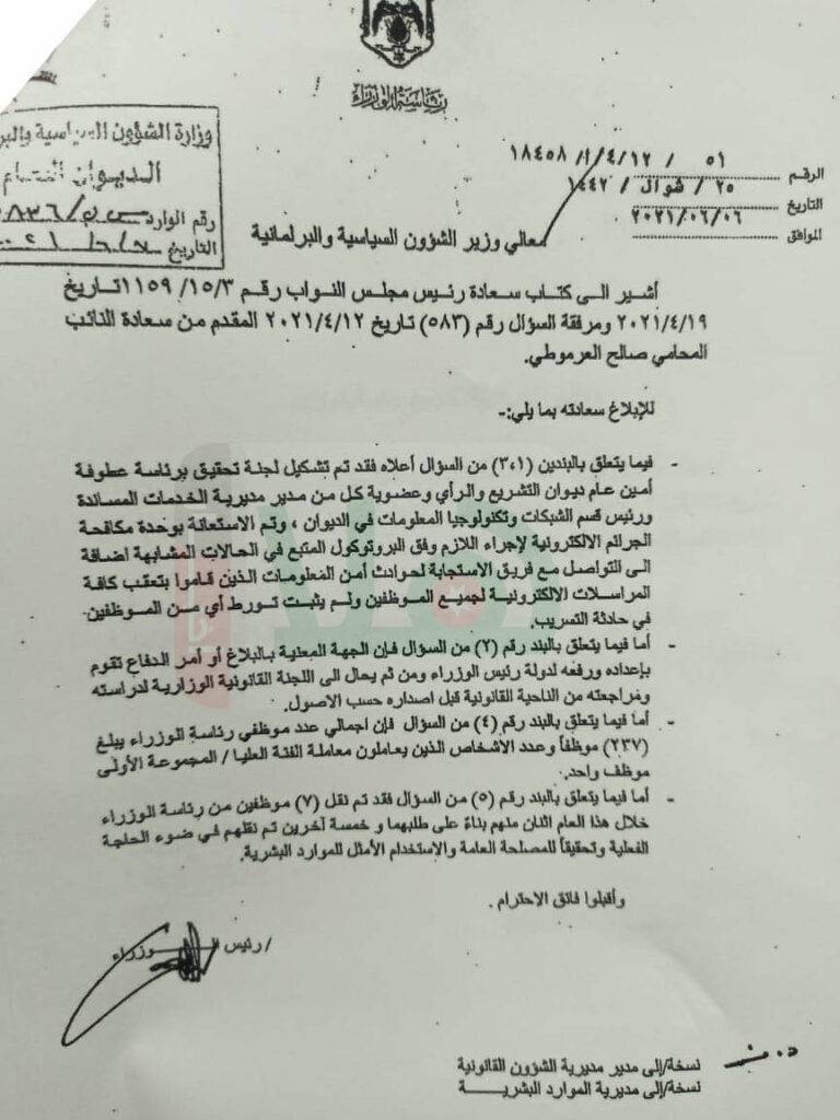 صدى الشعب – أجابت رئاسة الوزراء، اليوم الخميس، النائب صالح العرموطي، حول سؤاله المتعلق بتسريب وثائق أوامر الدفاع سابقاً. ووفق إجابة الحكومة، التي اطلعت عليها “هلا أخبار”، فقد تم تشكيل لجنة تحقيق برئاسة أمين عام ديوان التشريع والرأي، والاستعانة بوحدة مكافحة الجرائم الالكترونية، وفريق من وحدة أمن المعلومات. وتقول الحكومة في اجابتها، إن اللجنة المشتركة، قامت بتعقب كافة المراسلات الإلكترونية لجميع الموظفين ولم يثبت تورط أي من الموظفين في حادثة التسريب. وبينت الحكومة أن أوامر الدفاع تصدر من الجهة المعنية إلى رئيس الوزراء ثم يتم إحالتها إلى اللجنة القانونية الوزارية لدراستها ومراجعتها قبل إصدارها إعلاميا. وفي شهر آذار الماضي، تعهد وزير الدولة لشؤون الإعلام، الناطق باسم الحكومة الأردنية، صخر دودين، بـ”دحرجة رؤوس” مسربي وثيقة رسمية صادرة عن رئاسة الوزراء. وعلق الوزير، حينها على تسريب إجراءات الحكومة لمواجهة فيروس كورونا قبل إعلانها بشكل رسمي خلال مؤتمر صحفي عقد في رئاسة الوزراء، قائلا إن الجرائم الإلكترونية تحقق داخل مبنى رئاسة الوزراء بتسريب القرارات الحكومية قبل إعلانها. وأضاف دودين أنه إذا ثبت تورط أي موظف أو أي شخص موجود في مبنى رئاسة الوزراء أو غيرها بتسريب وثائق رسمية، فستكون “رؤوس تتدحرج” بسبب هذا الأمر.