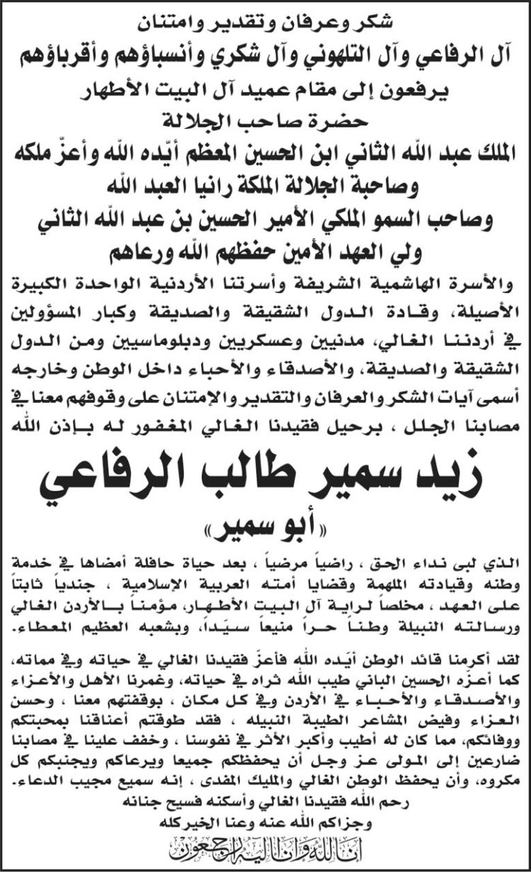 آل الرفاعي وآل التلهوني وآل شكري يرفعون إلى مقام عميد آل البيت الأطهار حضرة صاحب الجلالة الملك عبدالله الثاني إبن الحسين المعظم أيّده الله وأعزّ ملكه ، وصاحبة الجلالة الملكة رانيا العبدالله وصاحب السمو الملكي الأمير الحسين بن عبدالله الثاني ولي العهد الأمين حفظهم الله ورعاهم، والأسرة الهاشميّة الشريفة، وأسرتنا الأردنية الواحدة الكبيرة الأصيلة، وقادة الدول الشقيقة والصديقة وكبار المسؤولين في أردننا الغالي، مدنيين وعسكريين ودبلوماسيين ومن الدول الشقيقة والصديقة، والأصدقاء والأحباء داخل الوطن وخارجه، أسمى آيات الشكر والعرفان والتقدير والامتنان، على وقوفهم معنا في مصابنا الجلل ، برحيل فقيدنا الغالي المغفور له بإذن الله