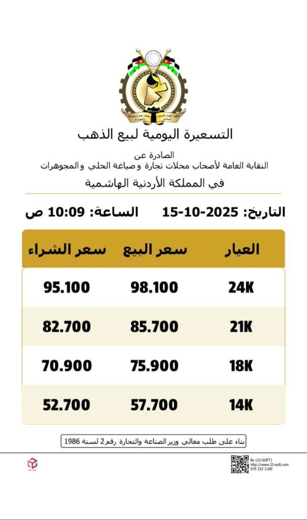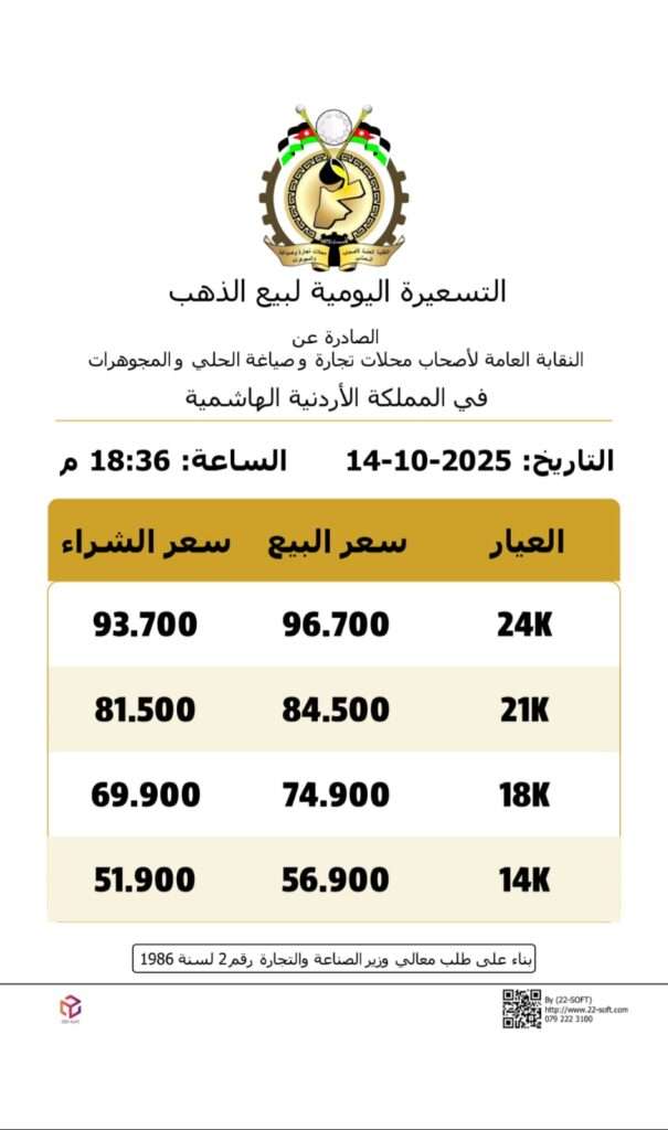 ووفقا للنشرة اليومية الصادرة عن النقابة العامة لأصحاب محلات تجارة وصياغة الحلي والمجوهرات، ارتفع سعر الغرام الواحد من الذهب لعيارات 24 و18 و14 إلى 98.1 دينارا و75.9 دينارا و57.7 دينارا على التوالي، لغايات البيع من محلات الصياغة.
