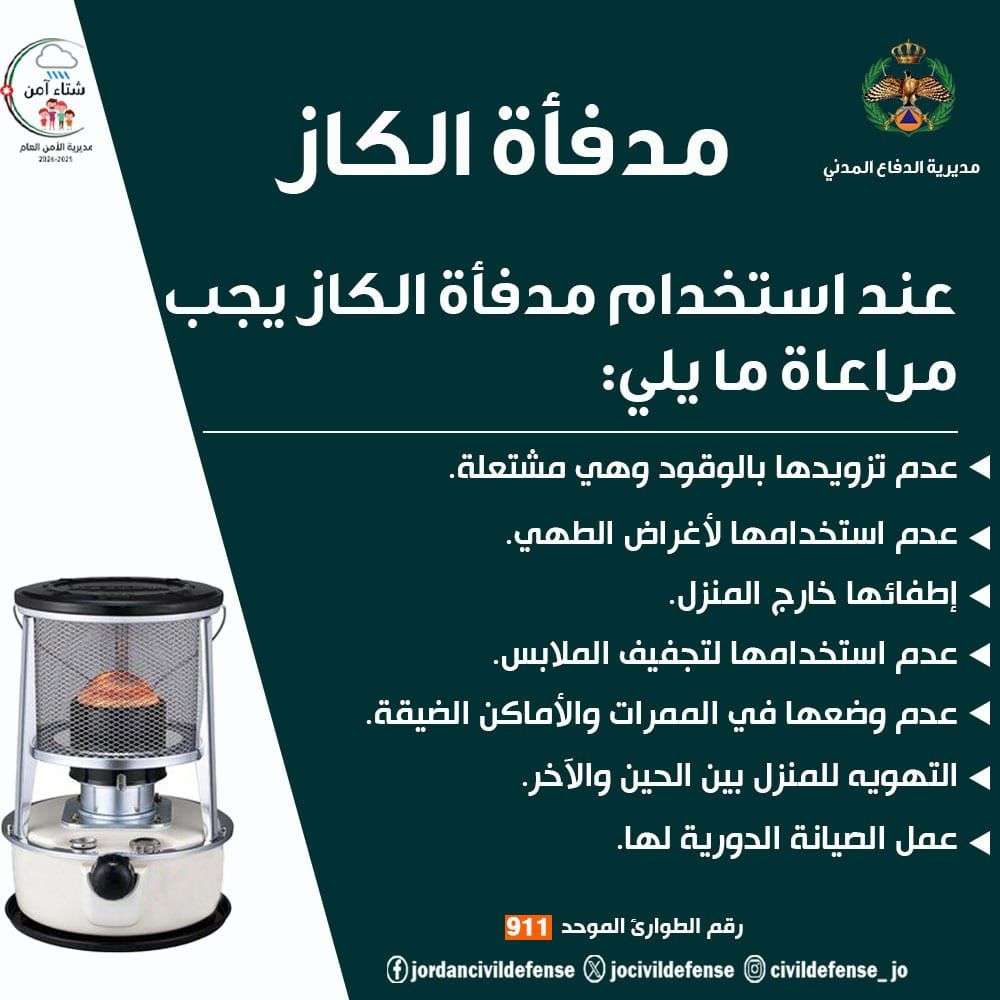 ■ الاستخدام الآمن لوسائل التدفئة على اختلاف أنواعها، وعدم تزويد المدفأة بالوقود وهي مشتعلة وعدم تركها مشتعلة أثناء النوم وضرورة توفير التهوية المناسبة بين الحين والآخر لتجديد الهواء وتقليل تراكم الغازات الضارة .