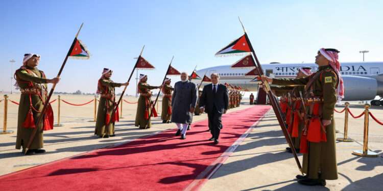 وجرت للضَّيف مراسم استقبال رسميَّة لدى وصوله مطار الملكة علياء الدَّولي، حيث اصطفّ حرس الشرف لتحيَّته، وعزفت الموسيقى السَّلامين الجمهوري الهندي والملكي الأردني.