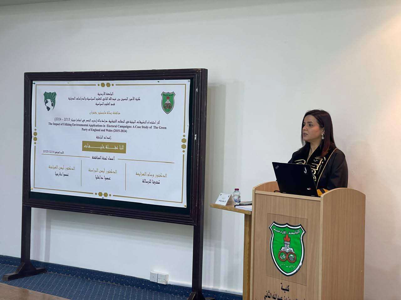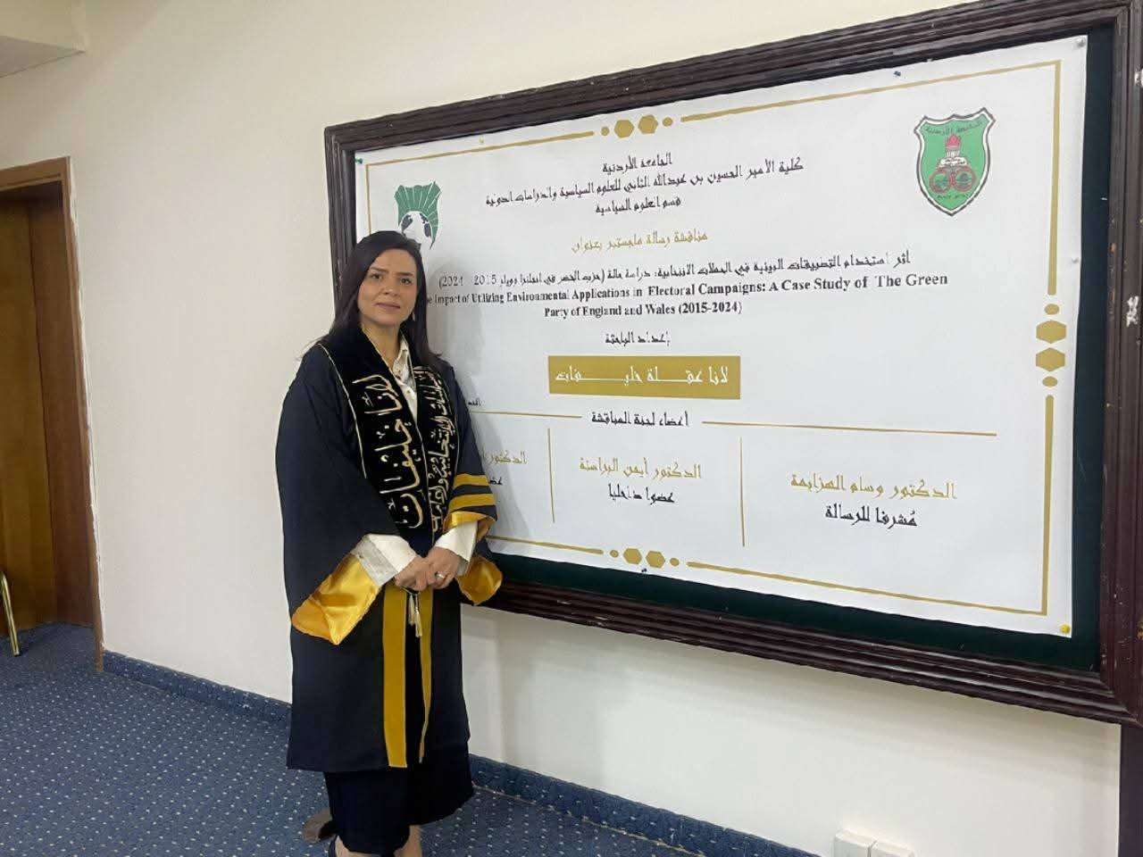 صدى الشعب – يتقدم الأهل و الأصدقاء و الأقارب بأجمل باقات التهاني و التبريكات للأستاذة لانا خليفات، بمناسبة مناقشتها لرسالة الماجستير الثاني بعنوان “أثر استخدام التطبيقات البيئية في الحملات الانتخابية: دراسة حالة (حزب الخضر في انجلترا وويلز 2015-2024)”