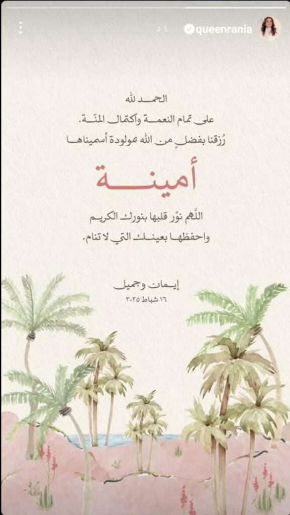 صدى الشعب – يسر الديوان الملكي الهاشمي أن يعلن بأن صاحبة السمو الملكي الأميرة إيمان بنت عبدالله الثاني، وسعادة السيد جميل ألكساندر ترميوتس، قد رزقا اليوم، الواقع في السابع عشر من شهر شعبان سنة 1446 هجرية، الموافق للسادس عشر من شهر شباط سنة 2025 ميلادية، وفي مستشفى الأمير هاشم بن عبدالله الثاني في العقبة، بمولودة أسمياها أمينة، جعلها الله قرة عين لوالديها.