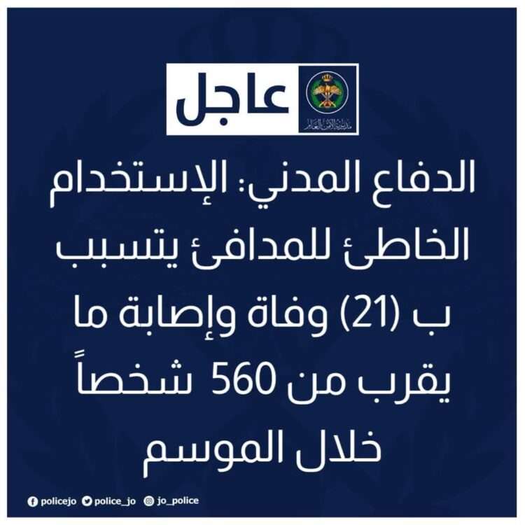 وأكد مدير الإسعاف والمساندة الإنسانية في مديرية الدفاع المدني العقيد أنور شديفات في حديثه لأمن إف إم أن مديرية الأمن العام لا تألوا جهدا في نشر الوعي وتقديم النصائح والإرشادات للمواطنين ورغم ذلك نجد أن البعض قد يستهين بخطورة المدافئ التي يعدّ الخطأ البسيط فيها قاتلاً