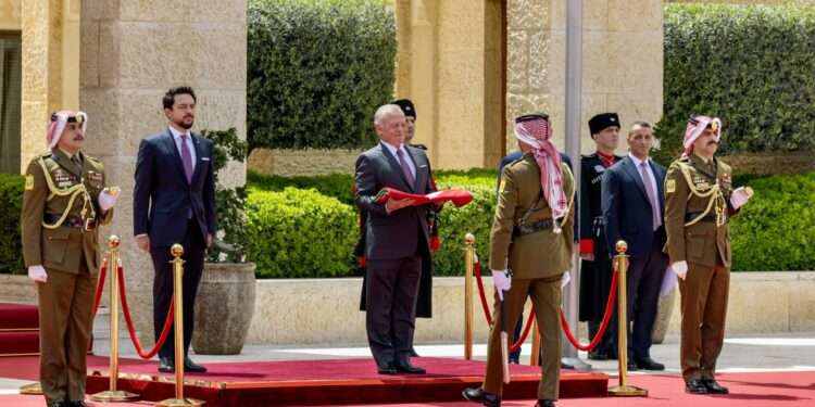 صدى الشعب – شهد جلالة الملك عبدالله الثاني في قصر الحسينية، اليوم الأربعاء، مراسم رفع العلم، بمناسبة اليوم الوطني للعلم الأردني، التي تصادف في السادس عشر من شهر نيسان من كل عام.