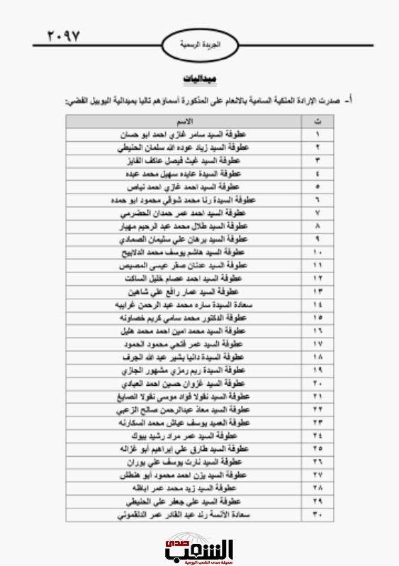 صدى الشعب – صدرت الإرادة الملكية بالإنعام على اكثر من 100 شخصية أردنية، بميدالية اليوبيل الفضي.
