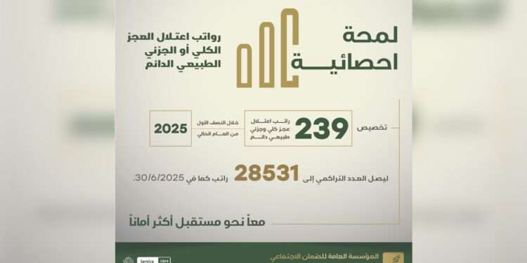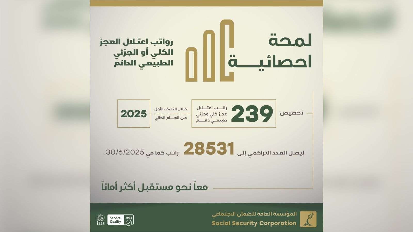 أعلنت المؤسسة العامة للضمان الاجتماعي عن تخصيصها (239) راتب اعتلال عجز كلي وجزئي طبيعي دائم خلال النصف الأول من العام الحالي 2025، ليصل العدد التراكمي إلى (28531) راتب كما في 30/6/2025.