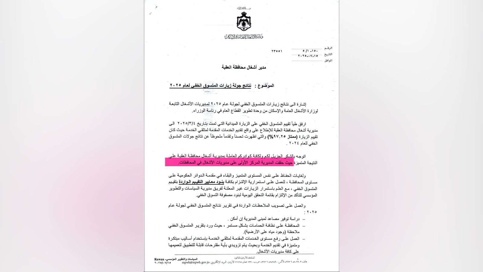 فازت مديرية أشغال العقبة بالمركز الأول على مستوى المملكة بين مثيلاتها من مديريات الأشغال بالمملكة بالمتسوق الخفي وبعلامة وصلت إلى ٩٧