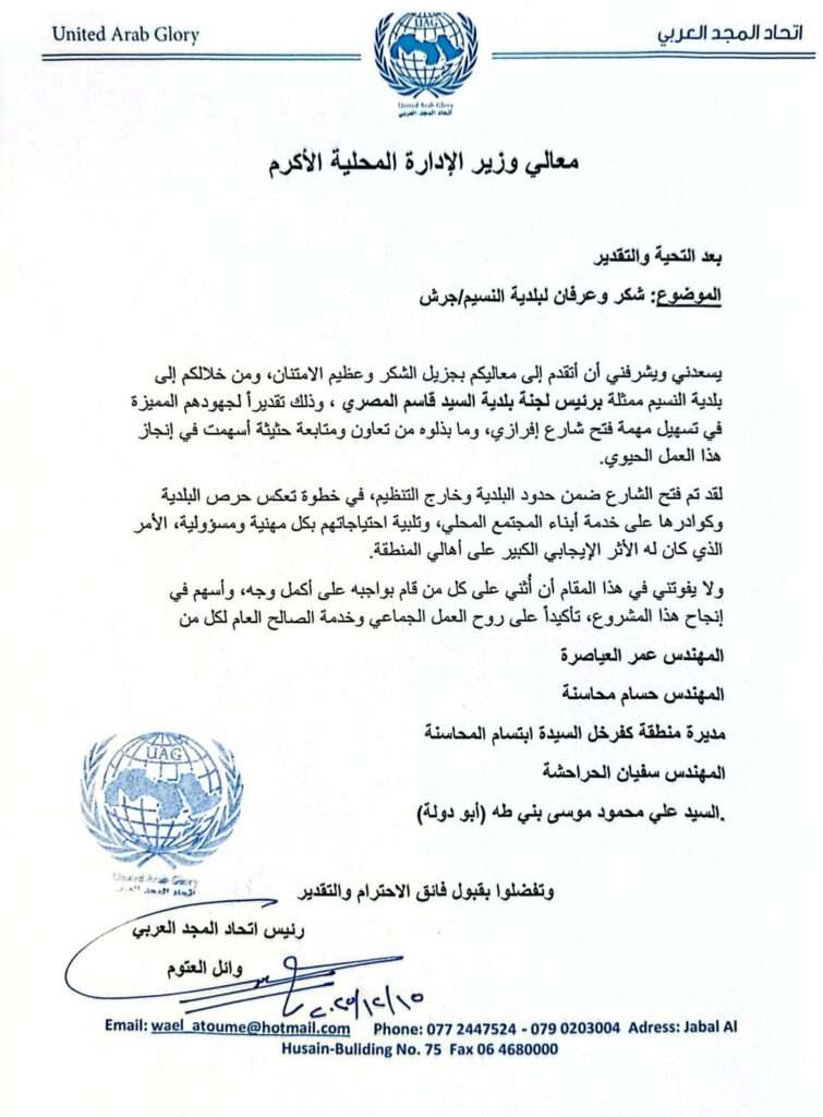 صدى الشعب – وجّه اتحاد المجد العربي كتاب شكر وتقدير إلى معالي وزير الإدارة المحلية، عبّر فيه عن بالغ شكره وامتنانه لبلدية النسيم – جرش، ممثلة برئيس لجنة البلدية السيد قاسم المصري، وذلك تقديراً لجهود البلدية المميزة في تسهيل فتح شارع إفراري، وما أبدته من تعاون ومتابعة حثيثة أسهمت في إنجاز هذا المشروع الحيوي.