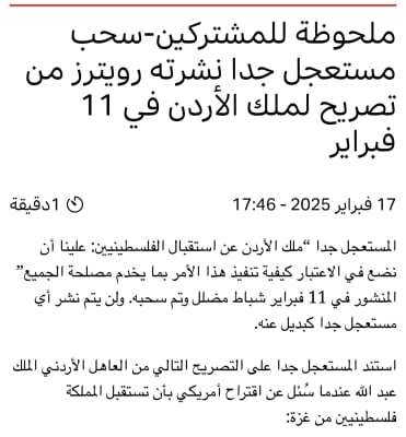 وفي ملحوظة نشرتها الوكالة للمشتركين، أوضحت الوكالة أن العاجل “لم يشمل تعليق (الملك) التمهيدي عن مقترح عربي بشأن غزة”.