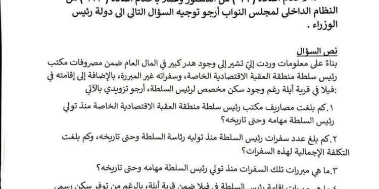 بناءً على معلومات وردت إليّ تشير إلى وجود هدر كبير في المال العام ضمن مصروفات مكتب رئيس سلطة منطقة العقبة الاقتصادية الخاصة، وسفراته غير المبررة، بالإضافة إلى إقامته في فيلا في قرية أيلة رغم وجود سكن مخصص لرئيس السلطة، أرجو تزويدي بالآتي: