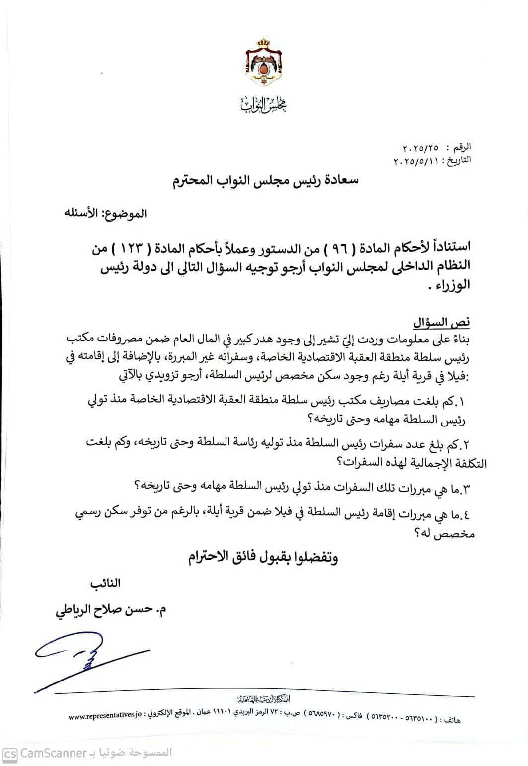 صدى الشعب – وجه النائب حسن الرياطي سؤالاً برلمانياً، يستوضح من خلاله سفريات رئيس مجلس مفوضي سلطة منطقة العقبة الاقتصادية الخاصة، إضافة إلى إقامته في فيلا بقرية أيلة، رغم وجود سكن وظيفي.