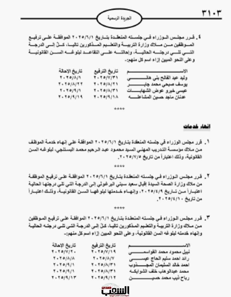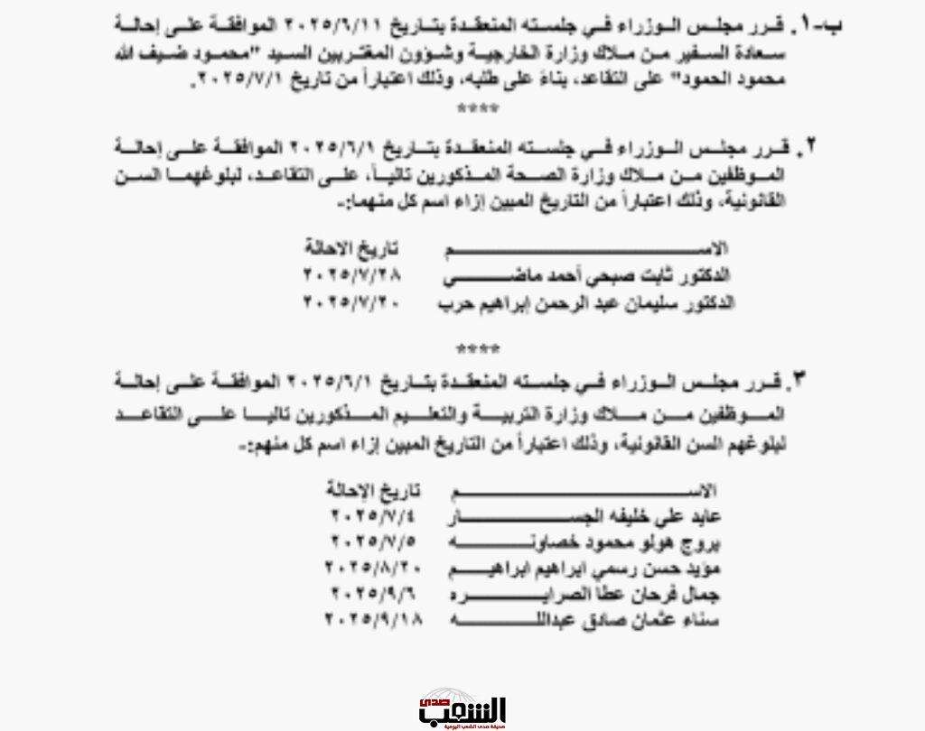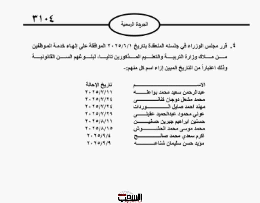 صدى الشعب - صدر في الجريدة الرسمية العدد "3102" الاثنين، قرار مجلس الوزراء بالموافقة على إحالة كل من الموظفين المذكورين تالياً إلى التقاعد اعتباراً من التاريخ المبين إزاء كل اسم لبلوغه السن القانونية وتاليا الأسماء: