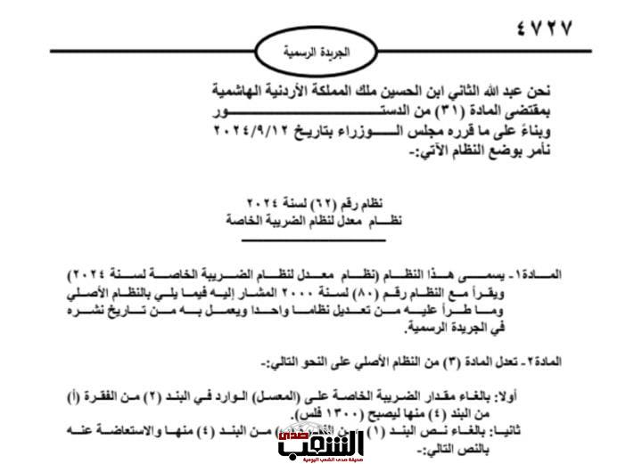 أولاً: بإلغاء مقدار الضريبة الخاصة على (المعسل) الوارد في البند (2)من الفقرة (أ)من البند (4) منها ليصبح (1300فلس ).”