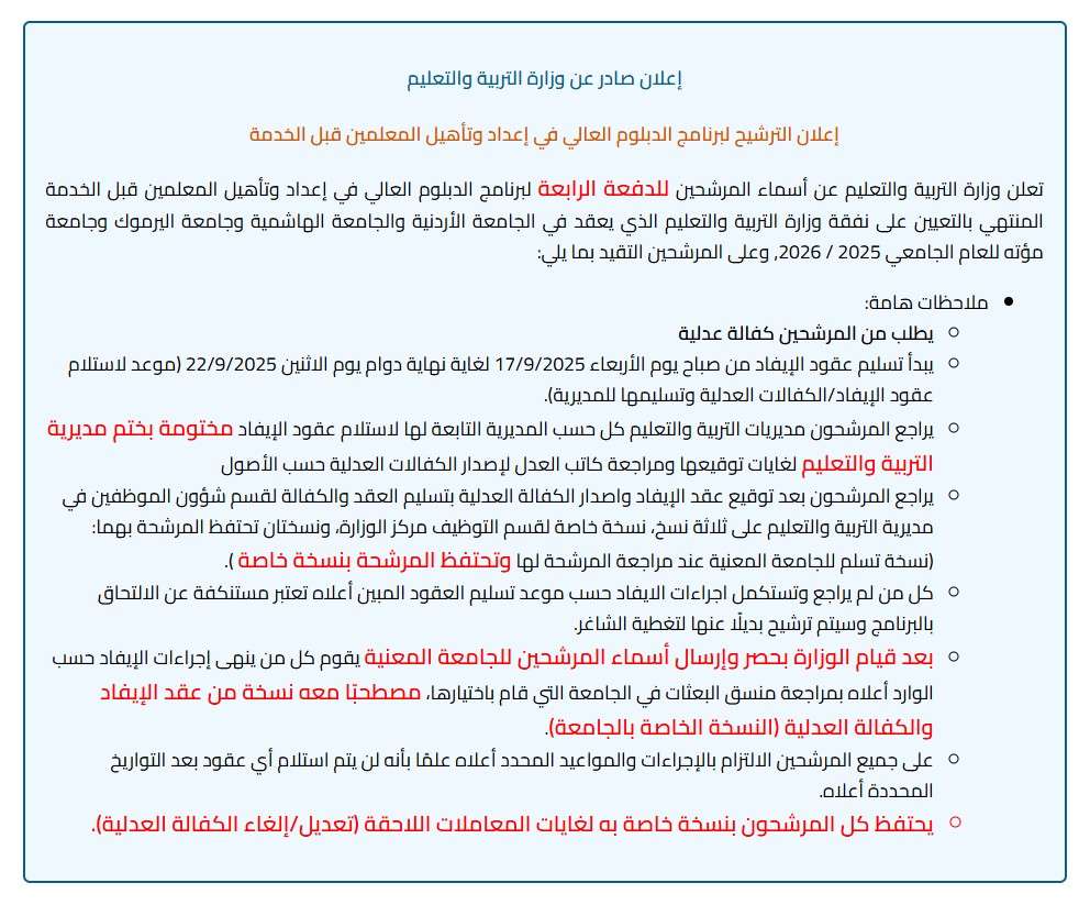 صدى الشعب – أعلنت وزارة التربية عن المرشحين للعام الجامعي 2025/2026 لبعثات برنامج الدبلوم العالي لإعداد المعلمين المنتهي بالتعيين على نفقة وزارة التربية والتعليم الذي يعقد في الجامعات الأربعة الشريكة الجامعة الأردنية، الجامعة الهاشمية ، جامعة اليرموك ، جامعة مؤته.