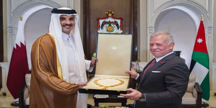 صدى الشعب – منح جلالة الملك عبدالله الثاني سمو الشيخ تميم بن حمد آل ثاني أمير دولة قطر ، قلادة الحسين بن علي تقديرا لسموه وتعميقا للعلاقات المتينة التي تجمع البلدين الشقيقين، وبمناسبة الزيارة الرسمية لسموه إلى الأردن.