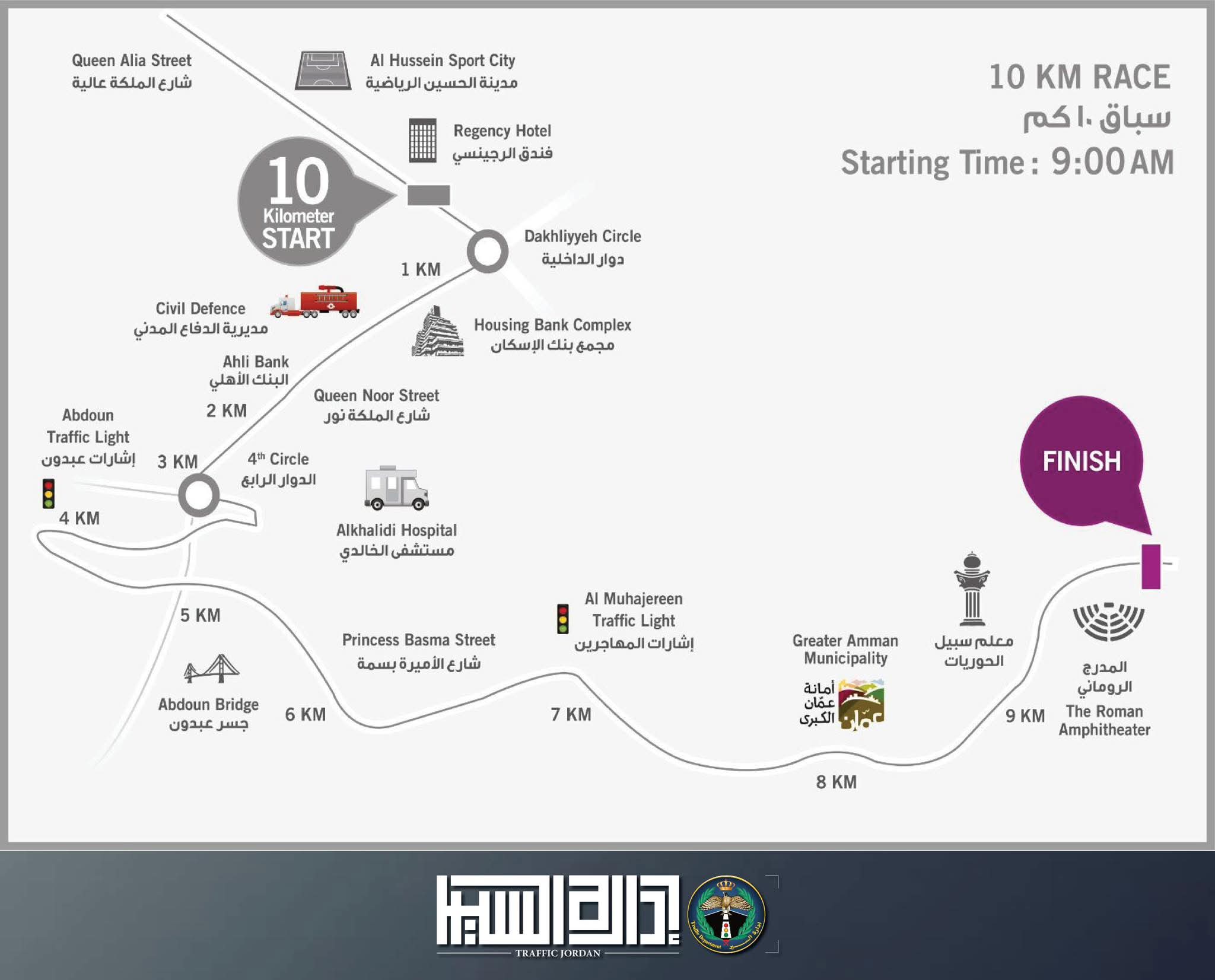 تشمل الإغلاقات كذلك شارع عقبة بن نافع وشارع الأميرة بسمة بشكل كامل، وذلك من الساعة السابعة صباحاً وحتى الساعة الثانية عشرة ظهراً، ضمن مسار سباق الـ10 كم الذي ينطلق في الساعة التاسعة صباحاً.