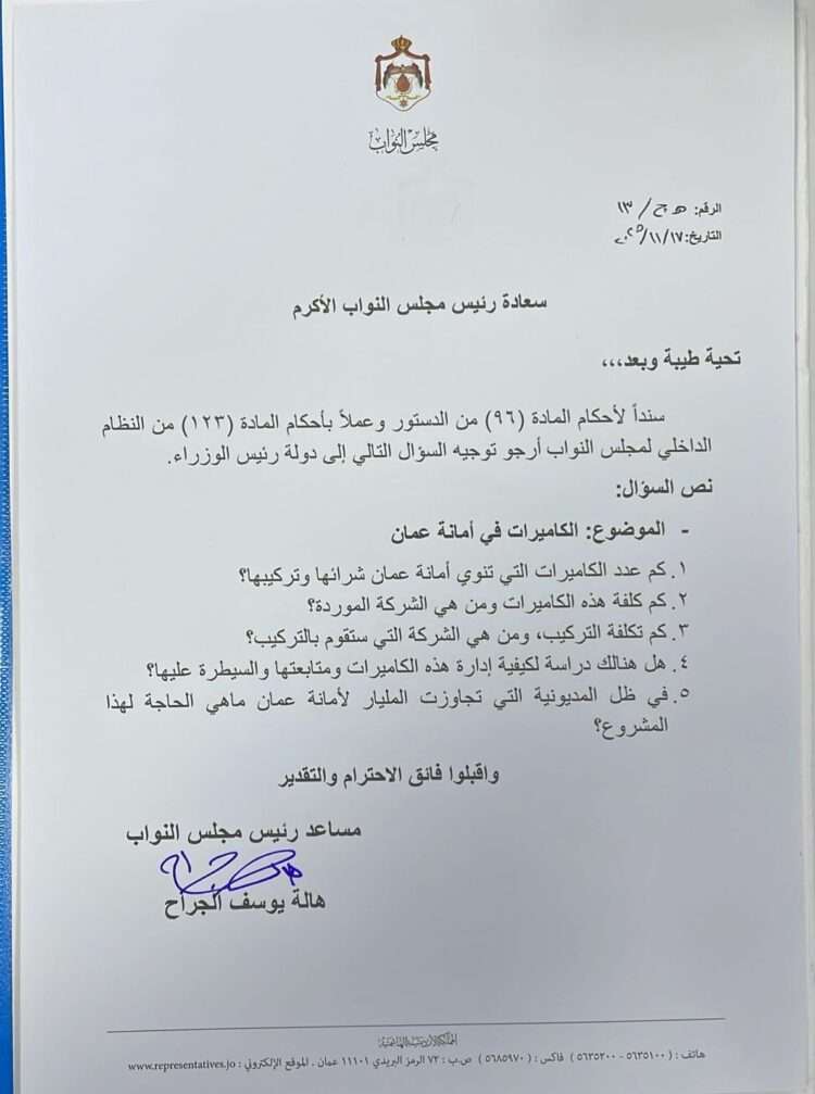 وجّهت مساعد رئيس مجلس النواب، النائب هالة يوسف الجراح، سؤالًا نيابيًا طالبت فيه بتوضيحات حول مشروع تركيب الكاميرات الجديد في أمانة عمّان الكبرى.
