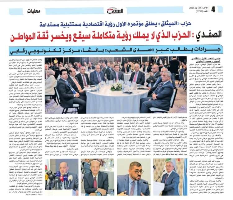 من جهته، أكد الأمين العام لحزب الميثاق الوطني أحمد الهناندة، أن المؤتمر يشكل محطة وطنية للنقاش المسؤول حول التحديات والفرص الاقتصادية ويسعى إلى ترسيخ شراكة حقيقية بين القطاعين العام والخاص تبنى على أسس الثقة والتكامل والابتكار، بما يسهم في خلق بيئة محفزة للنمو والاستثمار وخلق فرص العمل.