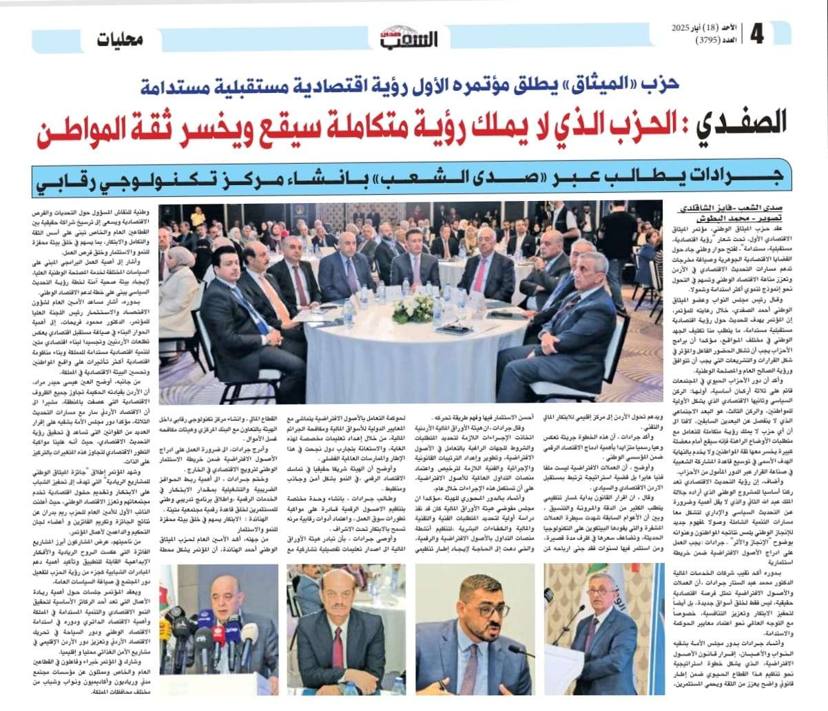 عقد حزب الميثاق الوطني، مؤتمر الميثاق الاقتصادي الأول، تحت شعار “رؤية اقتصادية، مستقبلية، مستدامة”، لفتح حوار وطني جاد حول القضايا الاقتصادية الجوهرية وصياغة مخرجات تدعم مسارات التحديث الاقتصادي في الأردن وتعزز مناعة الاقتصاد الوطني وتسهم في التحول نحو إنموذج تنموي أكثر استدامة وشمولا.