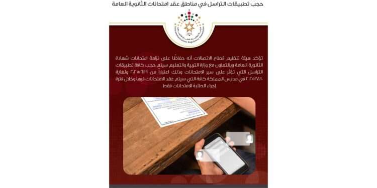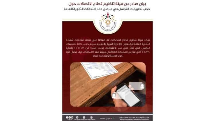 صدى الشعب _ تؤكد هيئة تنظيم قطاع الاتصالات أنه حفاظًا على نزاهة امتحانات شهادة الثانوية العامة وبالتعاون مع وزارة التربية والتعليم سيتم حجب كافة تطبيقات التراسل التي تؤثر على سير الامتحانات وذلك اعتباراً من 19/6/2025 ولغاية 10/7/2025 في مدارس المملكة كافة التي سيتم عقد الامتحانات فيها وخلال فترة إجراء الطلبة الامتحانات فقط.