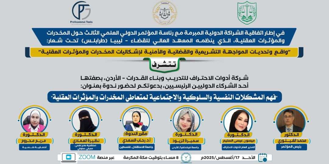 صدى الشعب – في إطار اتفاقية التعاون المبرمة مع رئاسة المؤتمر الدولي العلمي الثالث حول المخدرات والمؤثرات العقلية، الذي ينظمه المعهد العالي للقضاء في ليبيا والمقرر انعقاده وجاهيًا في طرابلس خلال الفترة من 25 إلى 28 نوفمبر 2025، نظمت شركة أدوات الاحتراف للتدريب وبناء القدرات – الأردن، مساء الأحد 17 أغسطس 2025 عبر منصة زووم، أولى الندوات العلمية الافتراضية بعنوان “فهم المشكلات النفسية والسلوكية والاجتماعية لمتعاطي المخدرات والمؤثرات العقلية”.
