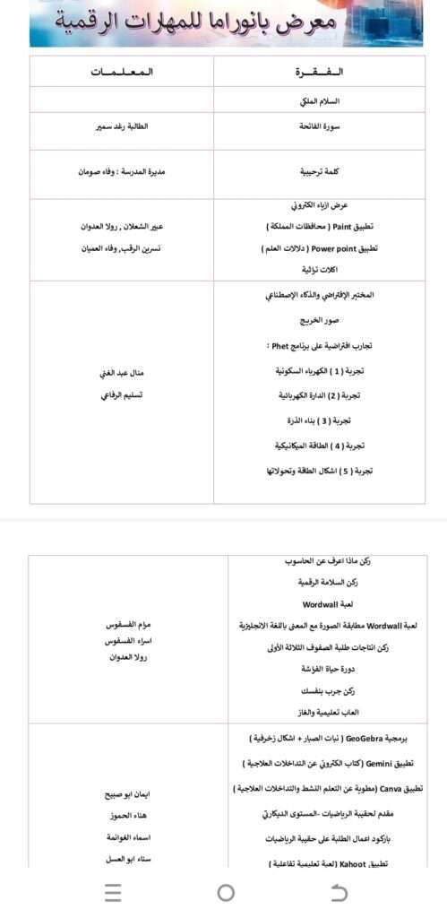 وفي كلمتها الترحيبية، أعربت مديرة المدرسة وفاء صومان عن اعتزازها بجهود المعلمات اللواتي قدّمن نماذج متميزة من الإبداع التربوي، مؤكدة أن نجاح هذا المعرض نتاج تعاون مدرسي واعٍ، ورؤية تؤمن بأن الاستثمار في المهارات الرقمية هو استثمار في جودة التعليم ومستقبل الطالبات.