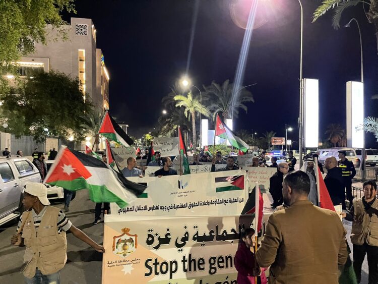 نظمت نقابة المهندسين الأردنيين فرع العقبة والفعاليات الشعبية مسيرة تضامنية أمس مع الأهل في قطاع غزة انطلقت من مسجد الشريف الحسين بن علي وصولا لدوار الشريف حسين وسط مدينة العقبة.