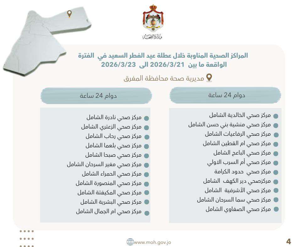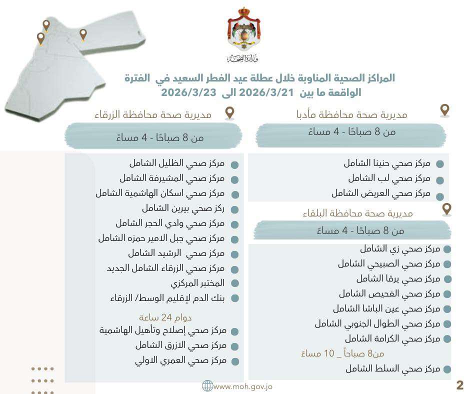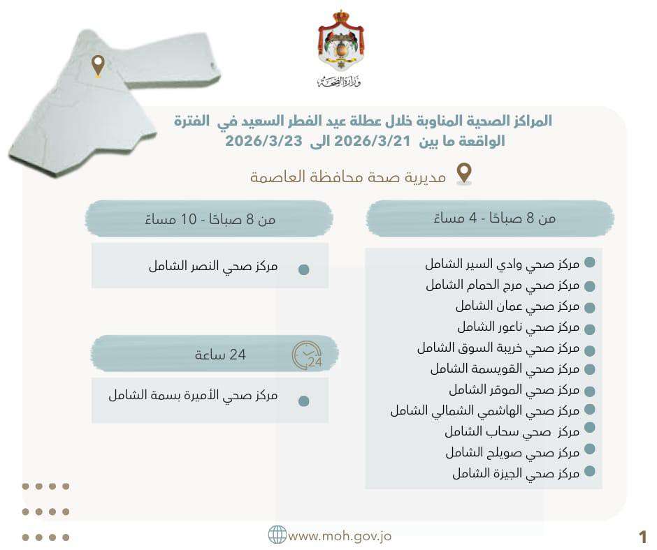 صدى الشعب - أعلنت وزارة الصحة، الخميس، عن أسماء المراكز الصحية المناوبة خلال عطلة عيد الفطر السعيد في الفترة الواقعة ما بين 21-23 آذار 2026, في جميع المحافظات وأشارت إلى أن عدد المراكز الصحية العاملة في المملكة خلال عطلة العيد 106 مراكز صحية.