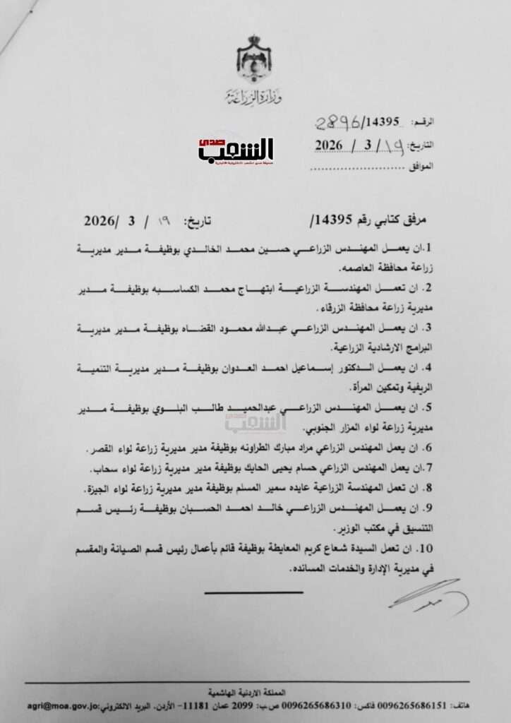 صدى الشعب – أجرى وزير الزراعة، الدكتور صائب خريسات اليوم الخميس 29 رمضان 2026، تشكيلات شملت 10 وظائف إدارية، (مدراء مديرية و رؤساء أقسام)، و من بين تلك التشكيلات، تعيين مهندس زراعي رئيساً لقسم التنسيق في مكتبه و نقل مديرة مكتبه للصيانة و تالياً الأسماء كاملة:
