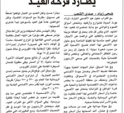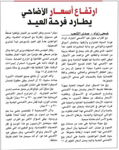 وفي جولة ميدانية على عدد من محلات بيع اللحوم في عمّان، أكد أصحابها بأن أسعار بيع الأضاحي لهذا العام شهدت ارتفاعًا ملحوظًا من حيث إقبال المواطنين، خاصة على أسعار بيع الأضاحي البلدية واليت وصل أسعار الكيلو إلى 11 دينارا حسبن ولكن العديد من التجار توقعوا ضعفًا غير مسبوق، مقارنة مع السنوات الماضية، ولكن المواطنين عادةً قبل العيد بأسبوعين تبدأ تشتري أضحيتها..