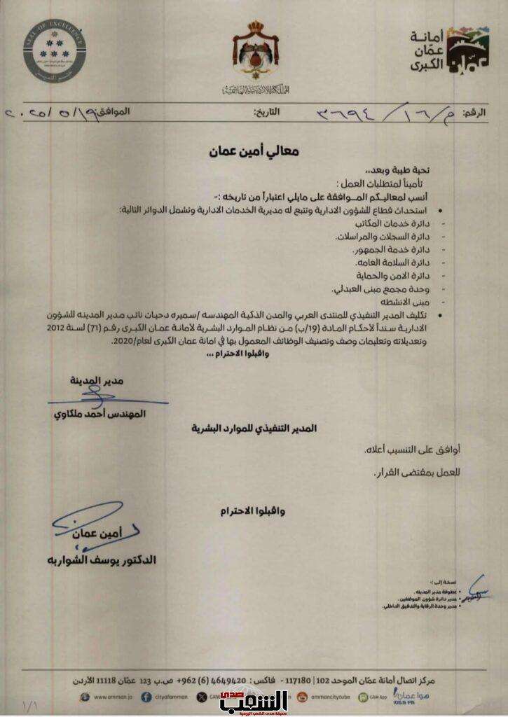 و بحسب الوثيقة الموجهة لـ(أمين عمان): “أنسب لمعاليكم الموافقة لى مايلي اعتباراً من تاريخه، (استحداث قطاع للشؤون الإدارية و تتبع له مديرية الخدمات الإدارية و تسمل الدوائر التالية: